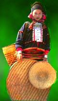 德昂族共有1.5万余人,分散居住在云南省德宏傣族景颇族白治州和镇康、耿马、永德、保山、澜沧等县;绝大多数与景颇、佤、汉等民族分寨杂居。德昂族原称崩龙族1985年改为现名。不同支系的德昂族服饰各有不同,当地人曾根据德昂妇女服饰的不同点,分别称为红崩龙,黑崩龙和花崩龙。德昂族妇女都爱穿蓝色或黑色对襟、尖领短上衣,在领边、襟前、下摆常用红布和各色绒球装饰,下身着统裙。所不同的是,红崩龙妇女的统裙下端有片红色;黑崩龙则在黑桶裙上织几条深红色带子,中间夹几条白带;花崩龙妇女的统裙下端有四条白带,中间夹一道红色。传说,很早很早以前,德昂族三姐妹一起杀牛,牛被杀伤倒地翻滚挣扎,牛尾染血乱甩,三姐妹的统裙都溅上了不同程度的牛血。于是她们按照统裙上牛血的位置和颜色织出新裙,就形成三种不同花色的统裙,分别传给后代。个别地区的德昂妇女还以藤篾制的“腰箍”缠腰为饰,多者缠到二三十圈,颇为别致。德昂族男女都爱戴头帕,并以绒球为饰。