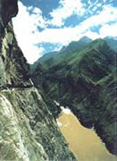 从核桃园有一小道可直通到峡底,贴着金沙江而行到中虎跳,这一段是”峡景”的精华.在峡底抬头看两边的山,那是真正需要把头抬举起来的感觉.在峡谷底行走,一边是咆啸的江水,一边是冰冷的岩壁,让人感到孤独和恐惧.大自然在这尽情的给你展示了一种无可抗拒的英雄气慨,让你觉得它永不会被征服.我有个朋友登上过不少的山峰,可我从来就没听他说出过征服一词.我想此时我的感受应同他一样吧,我们要学的是如何同大自然和蔼相处.,利用它远比去征服它更能使我们受益.从峡底上到TINA走高路到HALF WAY,这一段又是”山景”的精髓.在如诗的风光中行走,一条红色的小箭头总是及时的出现在你的眼前,这也算是哈巴一景吧.从TINA出发顺着小箭头两个小时左右可到HALF WAY,它是一家小客栈.店主姓冯,四川人氏,中年,风趣幽默,就象是一个邻家的大哥哥.在HALF WAY你不会不去两个地方,一是大名鼎鼎的"天下第一厕".怀着好奇推开厕门,不尽哑然失笑,原来如此......(不写出来是为了给还没去虎跳的朋友,留下个想象的空间);另一个就是它的小露台,要瓶啤酒邀上好友和着阳光和风,面对玉龙十三峰陡峭的山壁和奔腾的金沙江,天南地北的一阵乱侃,好不惬意.在这天我把心丢在了HALF WAY。