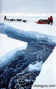 巨大的坚冰似乎总是在戏弄我们。一次,我们的狗被栓在Martin的帐篷附近,它们脚下的冰层突然从中间断裂。我们听到砰一声响,眼看着它们随冰块飘离营地。Julie追上去放开离断裂处最近的几条狗,Martin飞伸跃过冰缝,拔出固定栓,解救了其他的小家伙。